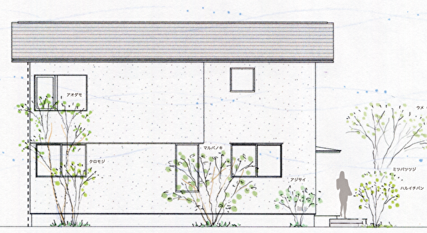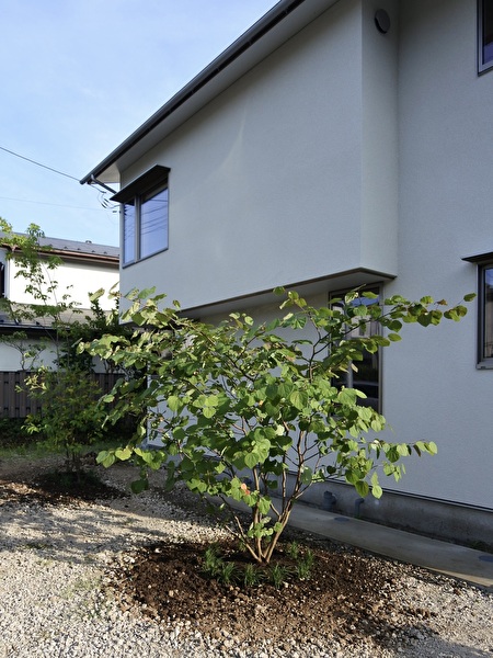 住宅地の通りに面した北側は、2階の窓に届くアオダモの下枝の少なさを補うようにクロモジを添えた当方定番の組み合わせに、普段は他の木と組み合わせて入れることが多いマルバノキをこちら側の風景を支えるようにドシリと一本で扱ってみました。