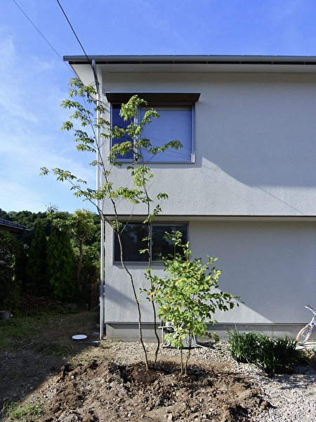 石敷きの屋外のリビングスペースと些細な植栽を追加して、来春に芝張り等の二期工事で仕上げる予定。