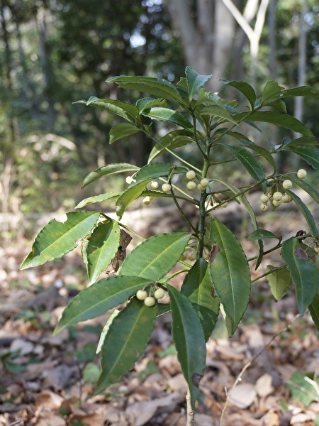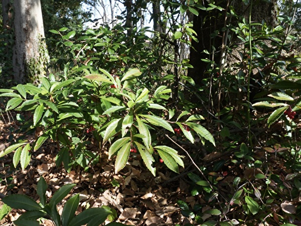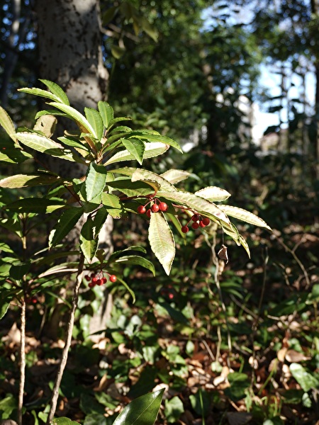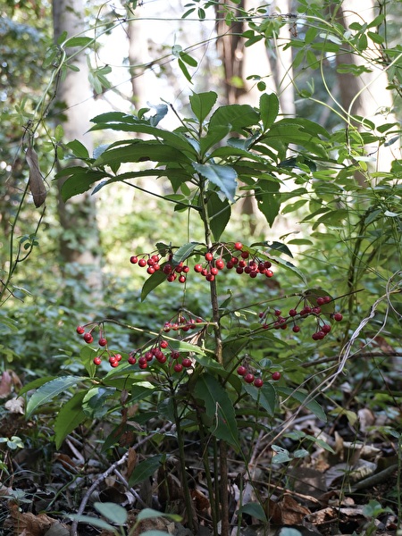年明けて、思い出したように近所の緑地に行けば、林床のあちこちで確かに縁起良さそうにたわわに実っていました。