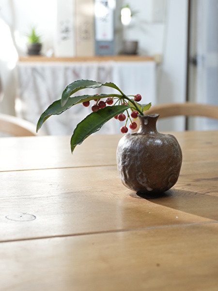 年の瀬に自宅の小路に知らぬ間に育っていたマンリョウの実成りに気がついて、このために作ってあったような自作のポテっと小さな一輪挿しに。