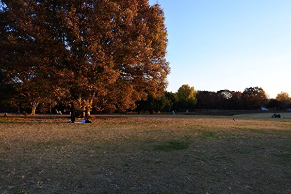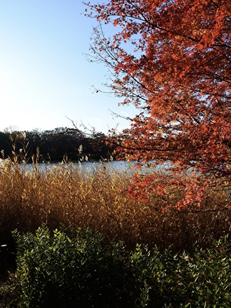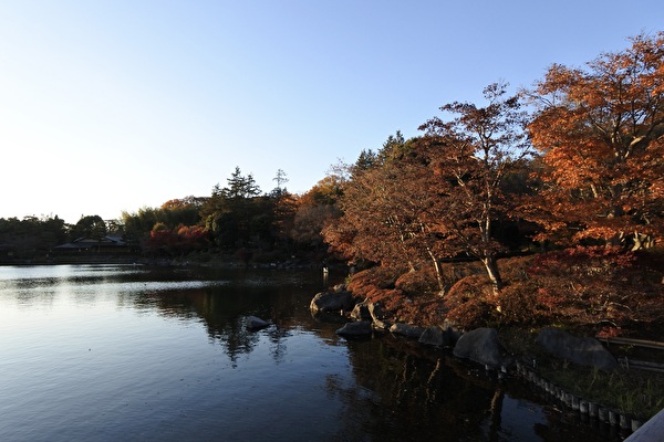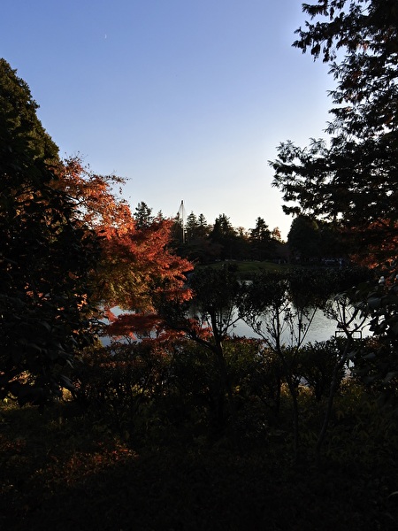 夕暮れに向かって、水鳥の池からイロハモミジの多い日本庭園へ