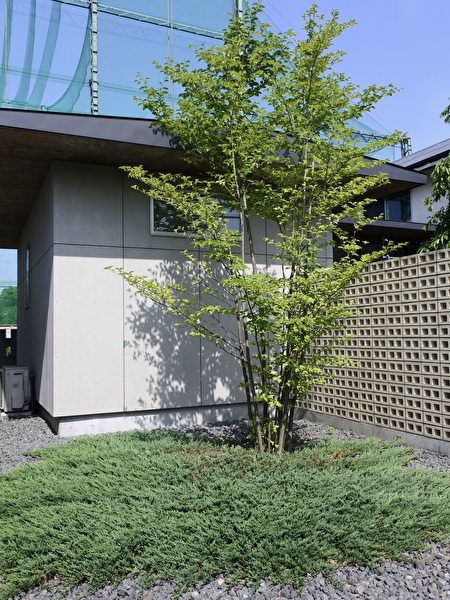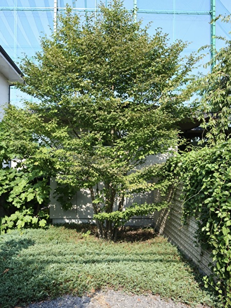住宅地の通りに面した北側は、2階の窓に届くアオダモの下枝の少なさを補うようにクロモジを添えた当方定番の組み合わせに、普段は他の木と組み合わせて入れることが多いマルバノキをこちら側の風景を支えるようにドシリと一本で扱ってみました。
