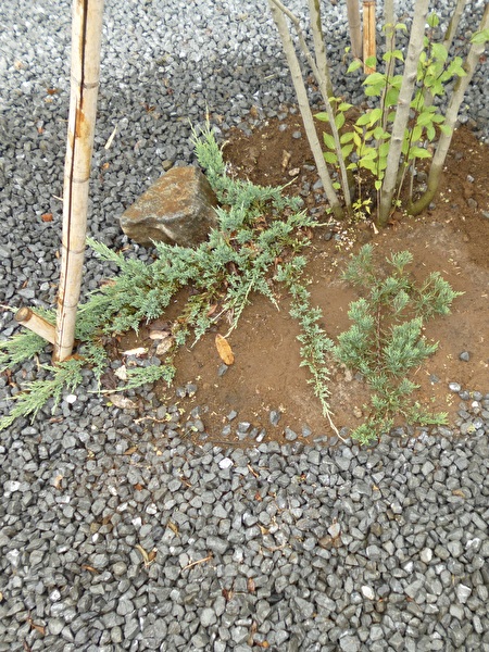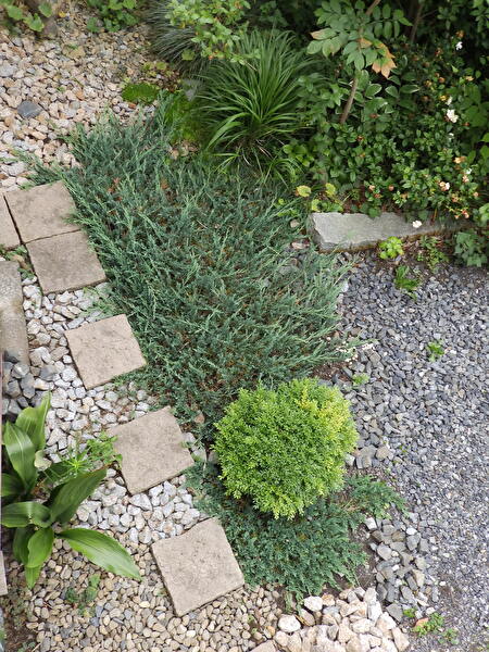 ウィルトニーという、やはり這性のコニファーを加えて性質を見定めようと以前のアトリエの庭の石と砂利敷のアプローチに這わして楽しんでいました。