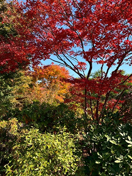 イロハモミジは、どれも比較的真っ赤に紅葉して、ヤマモミジは赤やオレンジや黄色が混ざるという認識ですが、モミジ類は雑種もあったり、個体差、環境の違いにもより秋の色づきは様々のようです。