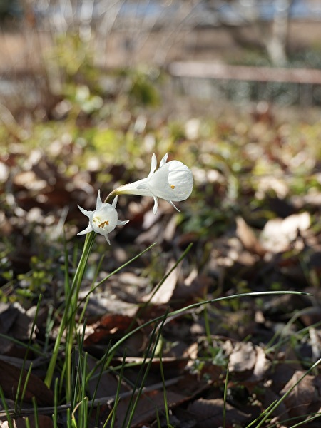 小ぶりの原種系スイセンと開きはじめたニホンスイセンは先週見かけたもの。