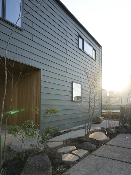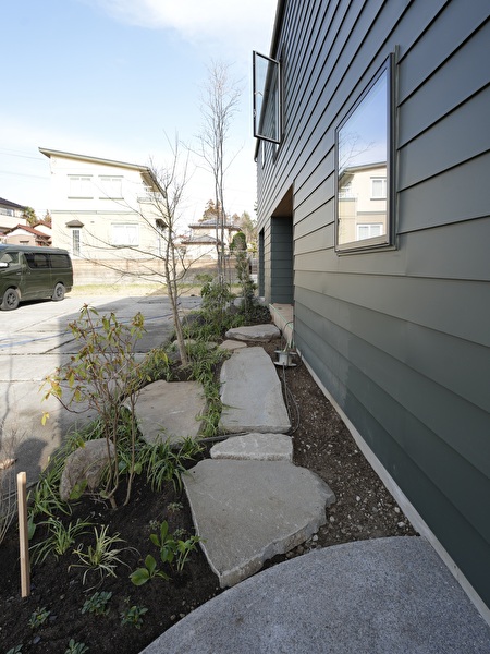 2.5m超の細長い鉄平石との出会いから生まれたアプローチのデザインでした。