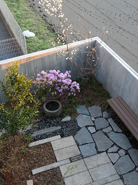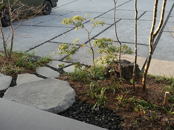 駐車場と建築との狭間、2メートル幅の細長いスペースのアプローチガーデン。
