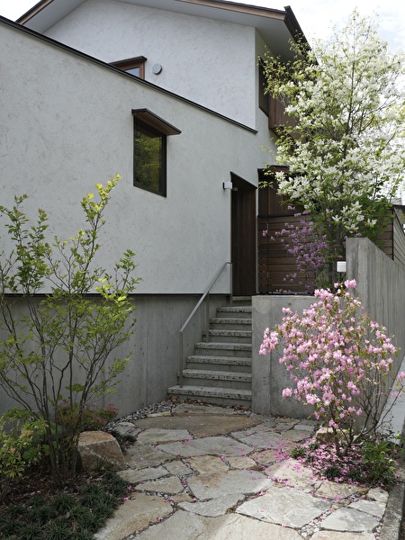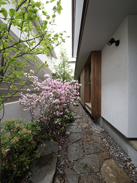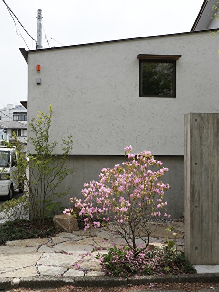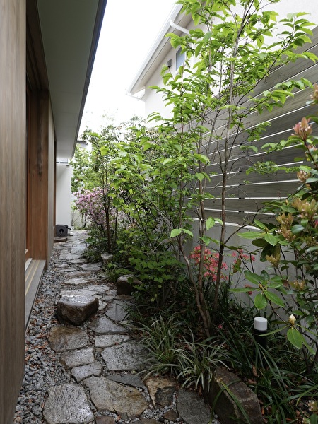 アプローチがある街角に向いた北面と、隣家に陽射しを遮られるプライベートな南の庭。